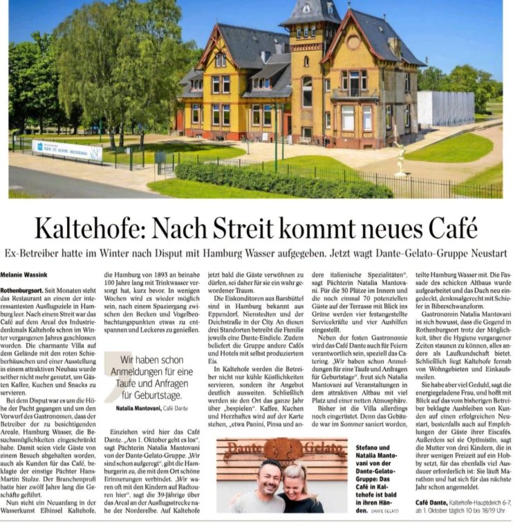 Familie Mantovani übernimmt ihren nächsten Standort und verzaubert damit den Hamburger Stadtteil Rothenburgsort. Nach dem süßen Eiscafé Dante in Nienstedten und dem beliebten Eiscafé Dante in der Deichstraße, freut sich die Familie über ihr schönes neues Bistro im historischen Ambiente. Freuen Sie sich auf eine große Vielfalt frisch zubereiteter Speisen und auf handgemachtes Gelato aus der eigenen Eisproduktion Dante Gelato in Barsbüttel.